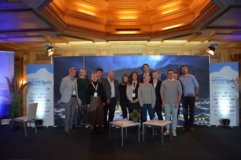 Die Medienakademie beim 15. Europäischen Mediengipfel in Lech – Hier bei der Arbeit: Josef Bertignoll, Lorenz Brunner, Viktoria Graf, Mia Hämmerle, Nikolaus Pichler, Leonie Schiessendoppler, Michael …